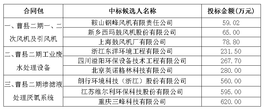 招标项目名称:betway88西汉姆联曹县生活垃圾焚烧发电厂二期工程一、二次风机及引风机,工业废水处理设备,渗滤液处理厌氧系统采购项目