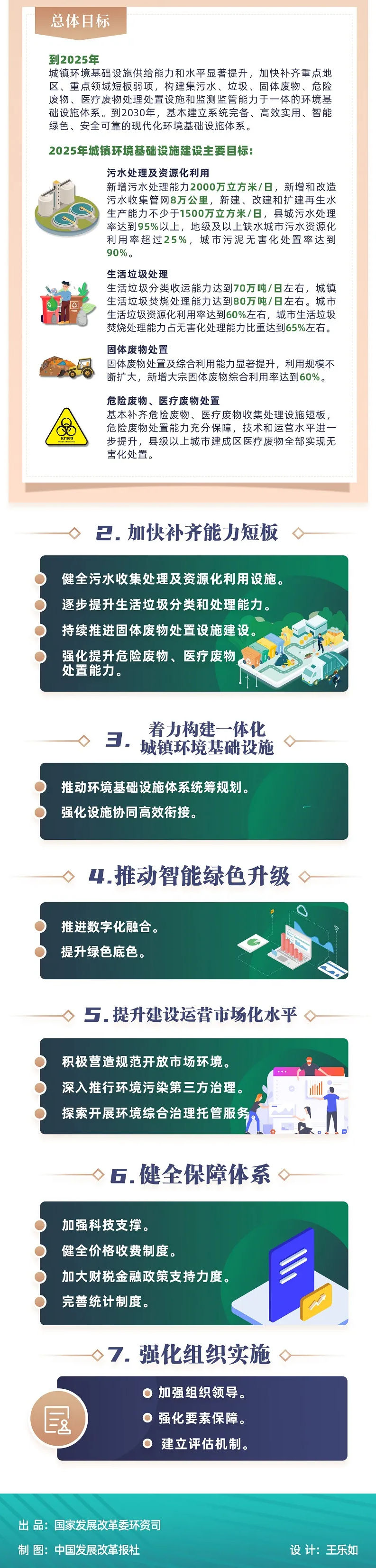 国家发展改革委、生态环境部、住房城乡建设部、国家卫生健康委发布《关于加快推进城镇环境基础设施建设的指导意见》,到2025年,城镇环境基础设施供给能力和水平显著提升,加快补齐重点地区、重点领域短板弱项,构建集污水、垃圾、固体废物、危险废物、医疗废物处理处置设施和监测监管能力于一体的环境基础设施体系。到2030年,基本建立系统完备、高效实用、智能绿色、安全可靠的现代化环境基础设施体系。图解如下: