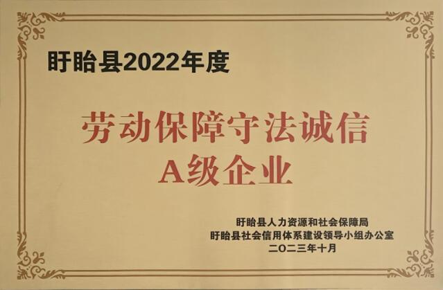 10月30日,江苏betway88西汉姆联荣获由盱眙县人力资源和社会保障局、盱眙县社会信用体系建设领导小组办公室颁发的盱眙县2022年度劳动保障守法诚信A级企业荣誉称号。