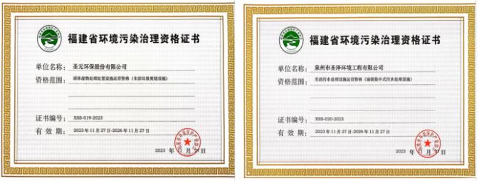 经审核,betway88西汉姆联股份有限公司和泉州市圣泽环境工程有限公司的申报材料符合要求,运营管理规范,同意颁发《福建省环境污染治理设施运营资格证书》。