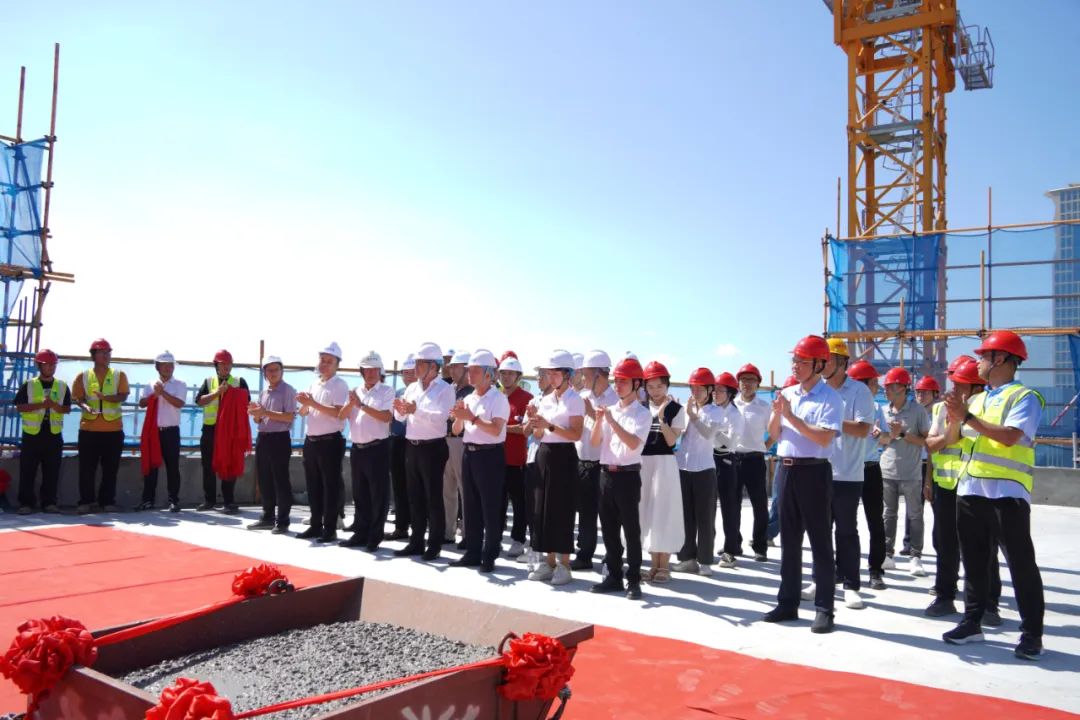 在《好日子》的欢腾旋律中,朱煜煊董事长挥动铲子浇筑首方混凝土,十余位嘉宾接力浇筑,封顶仪式圆满完成。