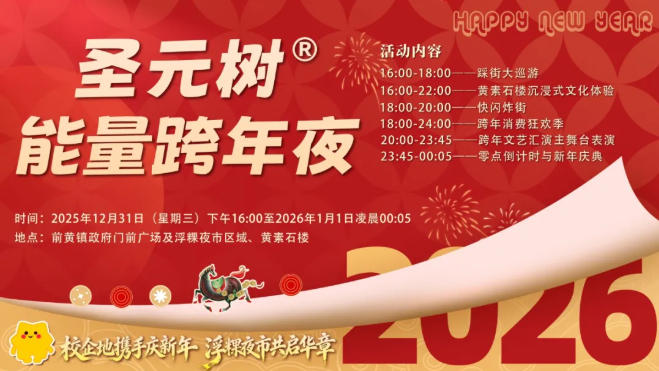 当天,活动自下午16:00启幕,精彩纷呈:能量满满的非遗文化节目踩街大巡游、黄素石楼沉浸式文化体验、快闪表演接连上演。18:00,当暮色降临,烟火升腾,前黄跨年盛宴的高潮篇章正式开启!如果说白天的巡游与石楼雅集是文化漫步,那么浮粿夜市就是一场汇聚美食、福利、艺术与欢声的跨年狂欢主场!这里有舌尖风味、手作体验、超值福利、街头艺术,还有贯穿全场的“福袋迎新”终极彩蛋等您来拿!